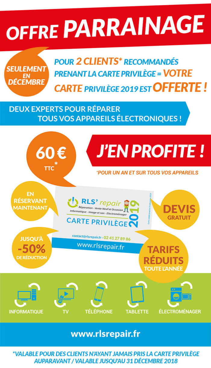 En décembre exclusivement, RLS’Repair vous propose une offre de parrainage : pour 2 clients recommandés* prenant la carte privilège, votre carte privilège 2019 est offerte !